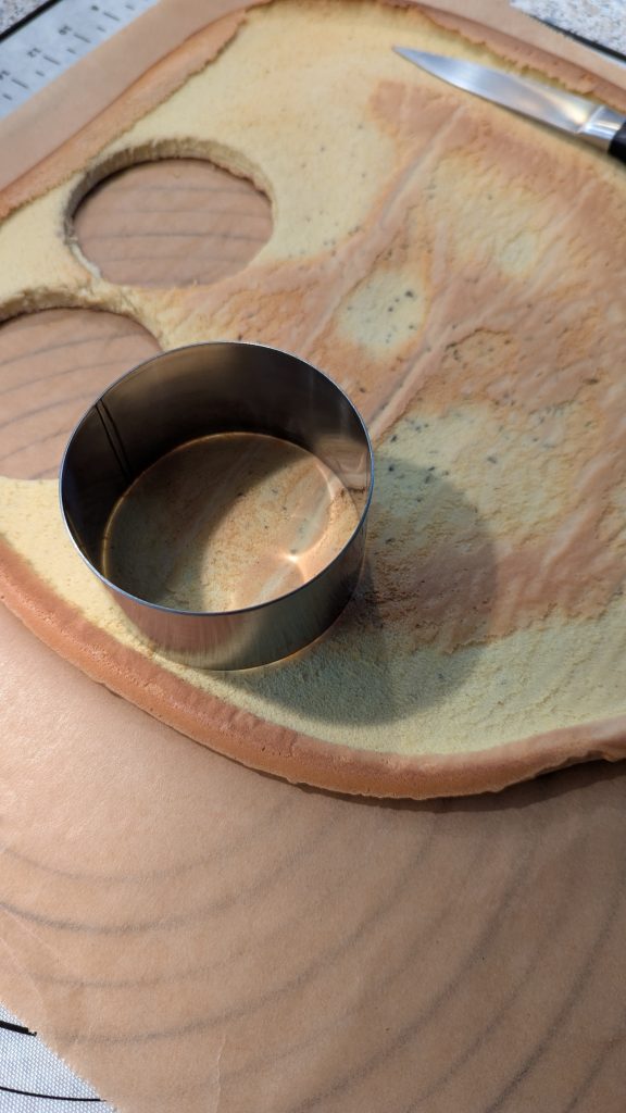 Aus dem abgekühlten Biskuit mit einem Servierring oder einem Glas 8 Kreise ausstechen.