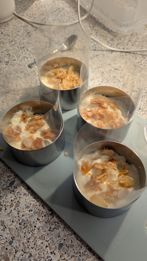 Einen Boden in den Ring legen, darauf Puddingcreme und Mandeln verteilen. Diesen Vorgang wiederholen.