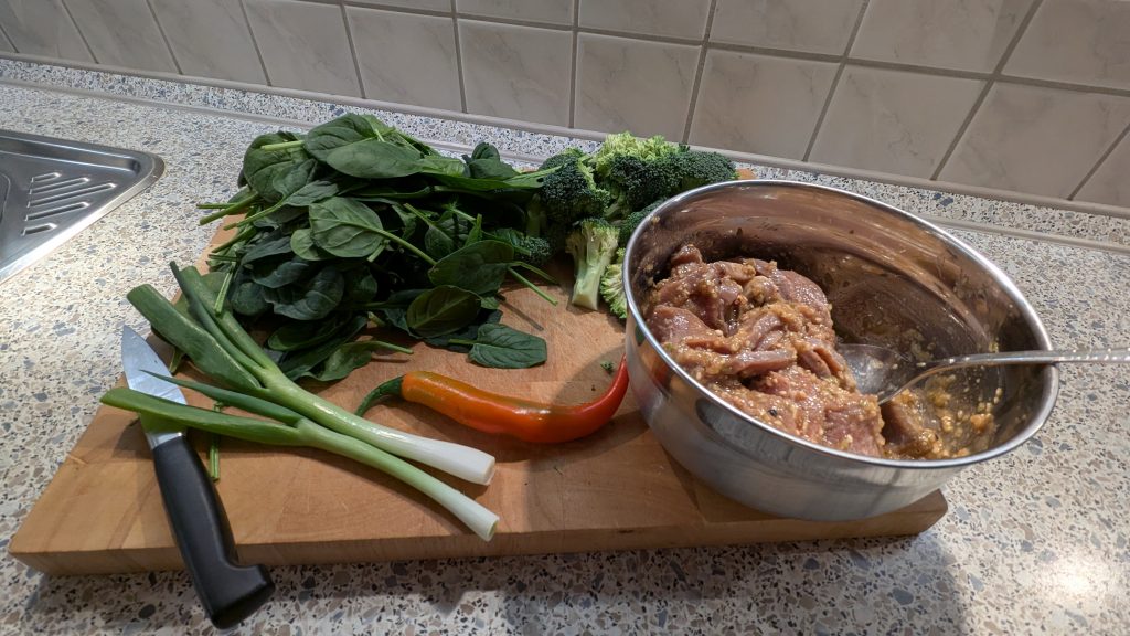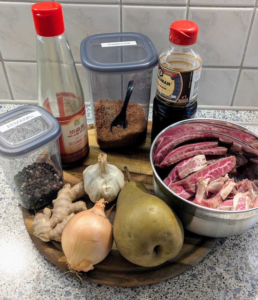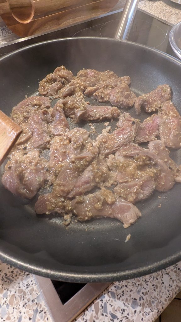 Das Rindfleisch wird in dünne Streifen geschnitten und in der Marinade für mindestens 30 Minuten, idealerweise über Nacht, mariniert.