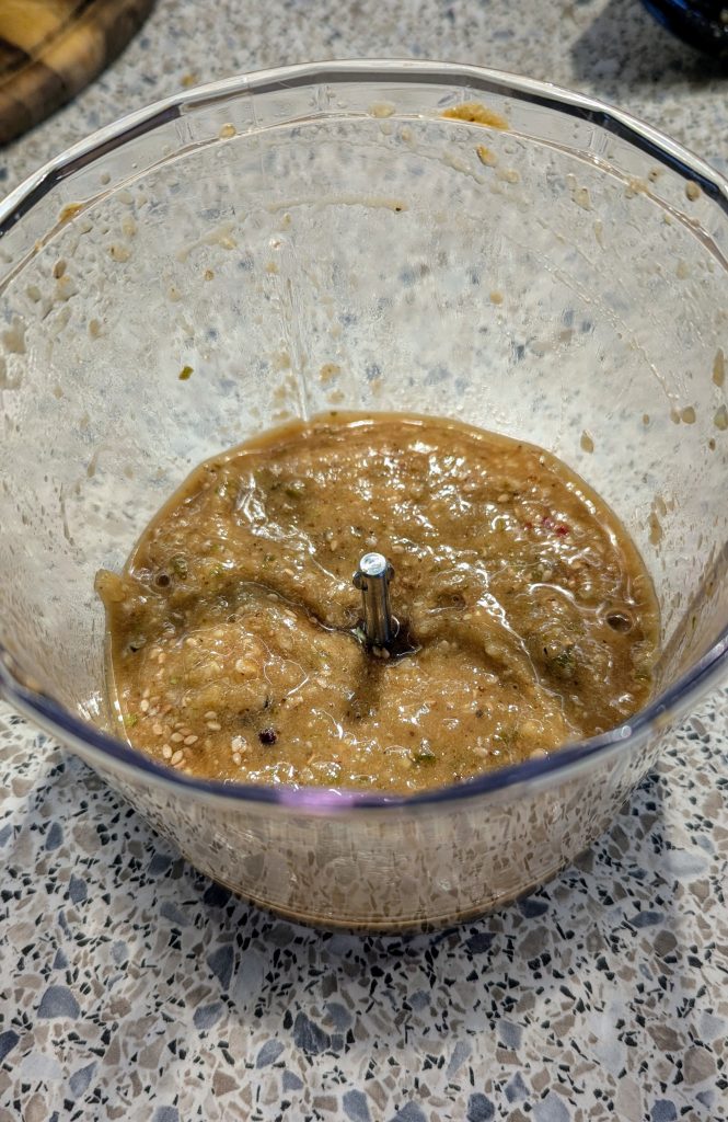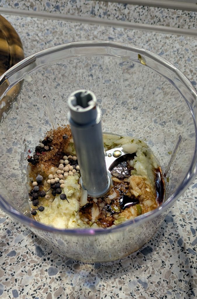 Nashibirne schälen und zusammen mit Zwiebel, Ingwer und Knoblauch in einen Küchenmixer geben und fein pürieren. Sojasauce, Zucker, Sesam, Sesamöl und schwarzen Pfeffer dazu geben und noch einmal mixen.