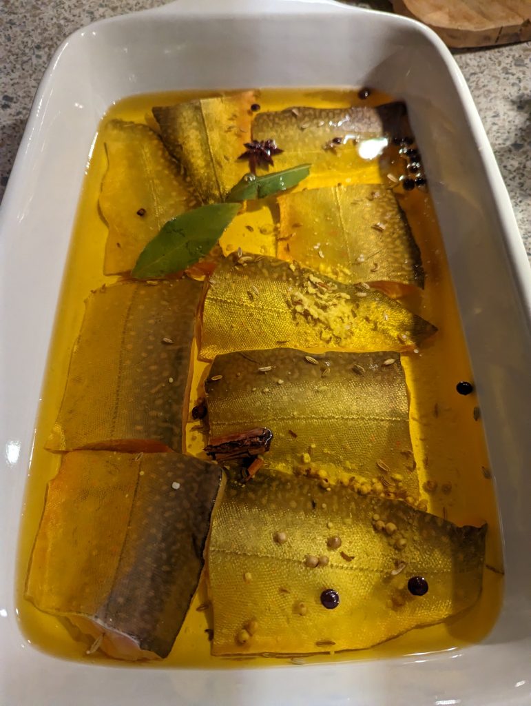 Backofen auf 80 °C Ober-/Unterhitze vorheizen. Lege die Saiblingsfilets in eine ofenfeste Form, die nicht viel grösser als die Filets sein sollte. Gib die angedrückten Knoblauchzehen, Thymian, Lorbeerblätter und die Gewürze zu den Filets. Übergiesse die Filets mit Olivenöl, bis sie vollständig bedeckt sind. Das Öl sollte nicht kochen, sondern nur leicht warm werden. Stelle die Form in den vorgeheizten Ofen und confiere den Saibling für etwa 20-30 Minuten, oder bis er sich leicht mit einer Gabel zerteilen lässt. Die genaue Garzeit hängt von der Dicke der Filets ab.