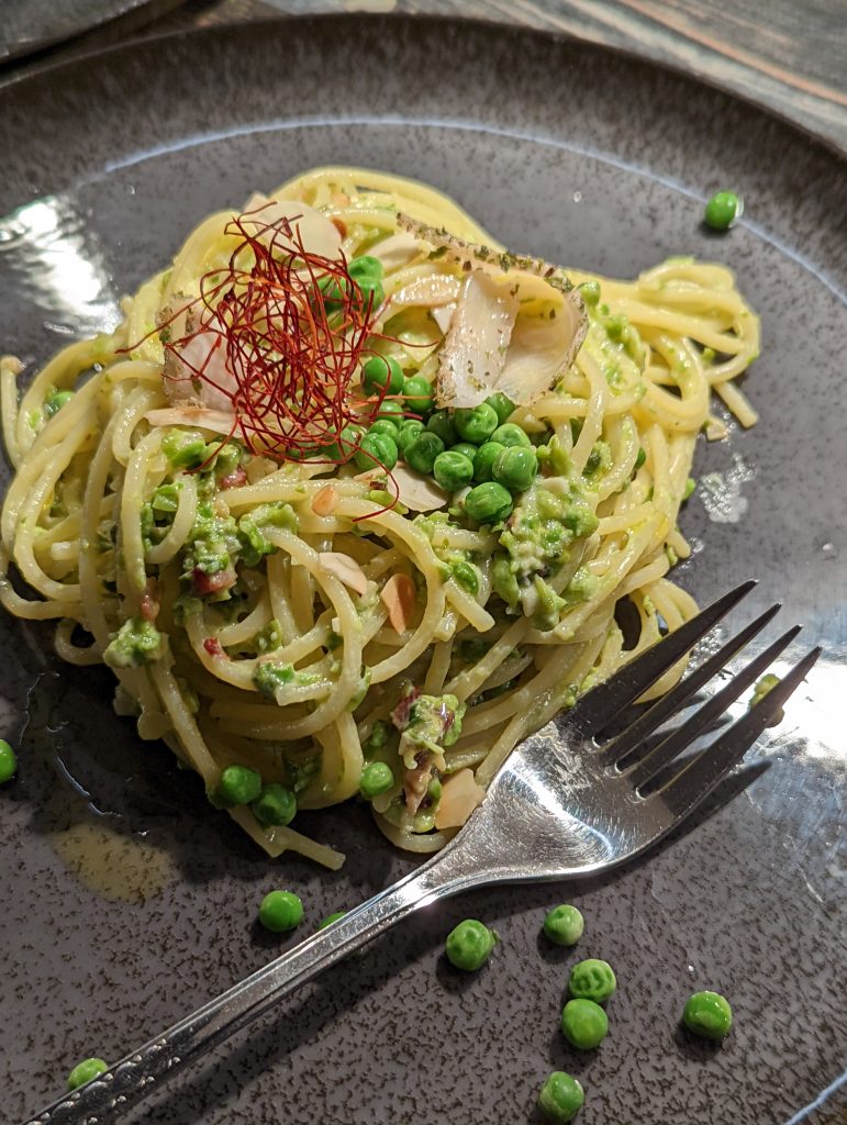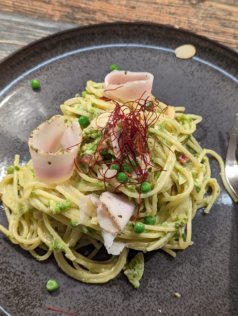 Auf dem Teller anrichten und die restliche Erbsenmischung und Speck darüber verteilen. Optional noch etwas frisch geriebenen Parmesan darüber reiben.
