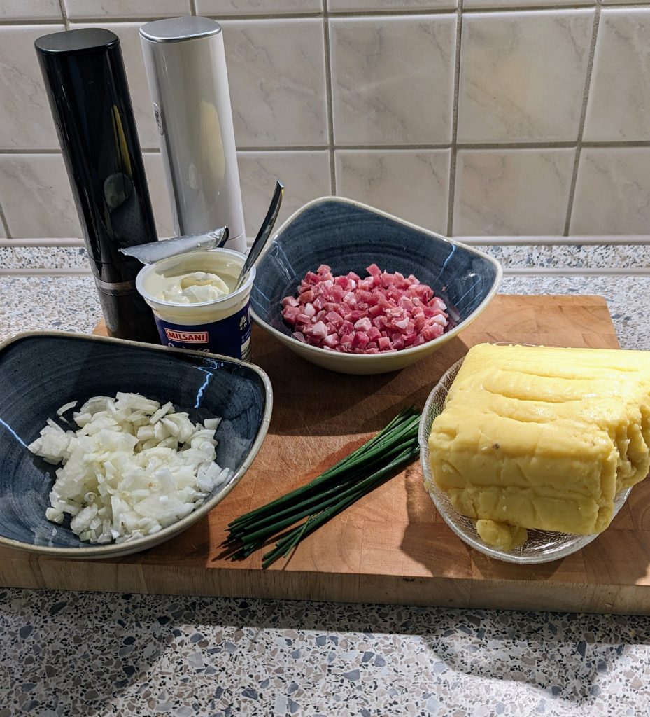 Noch einmal für 15 Minuten in den Backofen. Vor dem servieren mit Schnittlauch bestreuen.