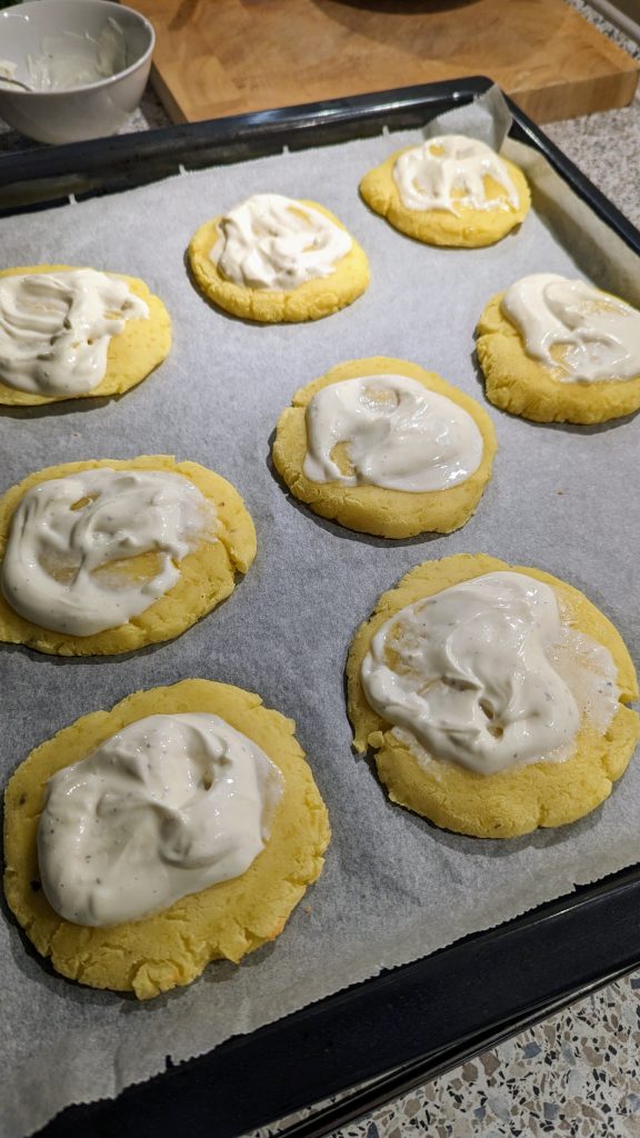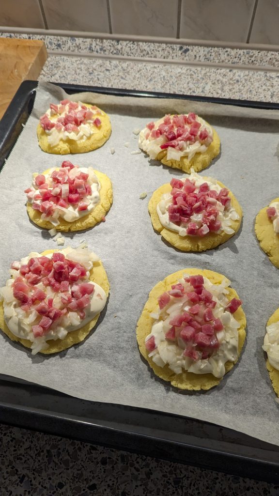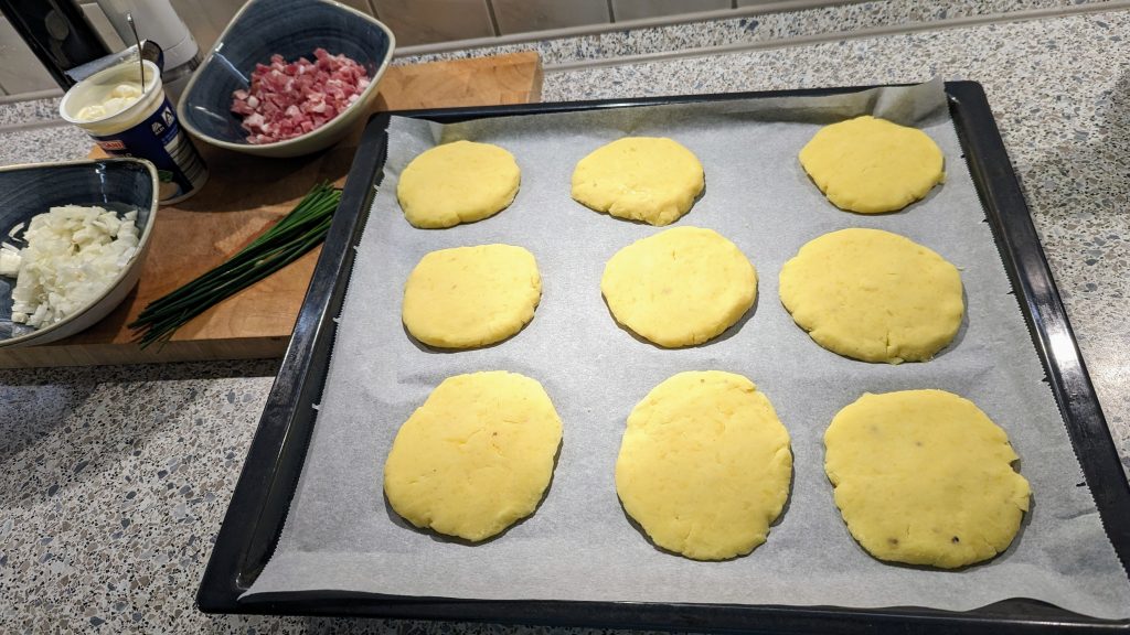 Aus dem Knödelteig neun Kugeln Formen, platt drücken und auf ein Backblech mit Backpapier legen.