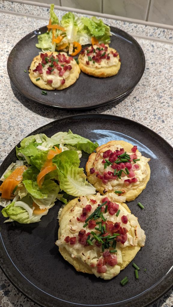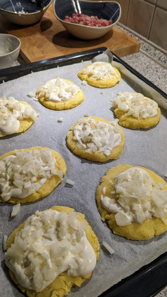 Creme fraiche mit Salz und Pfeffer verrühren, Zwiebeln schälen und klein würfeln. Auf den vorgebackenen Küchlein erst Creme fraiche, dann Zwiebeln und zum Schluß den Speck verteilen.