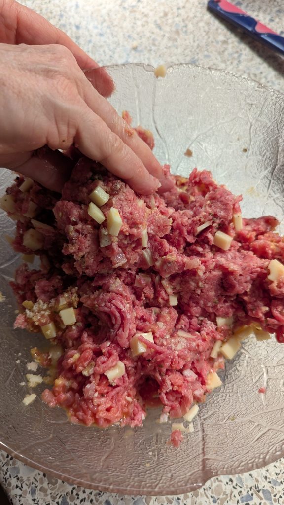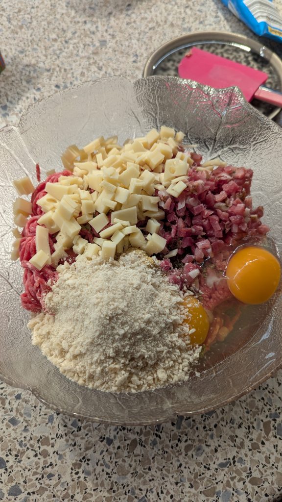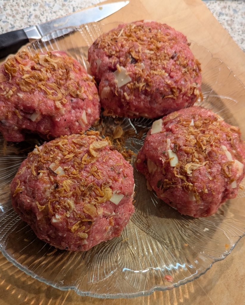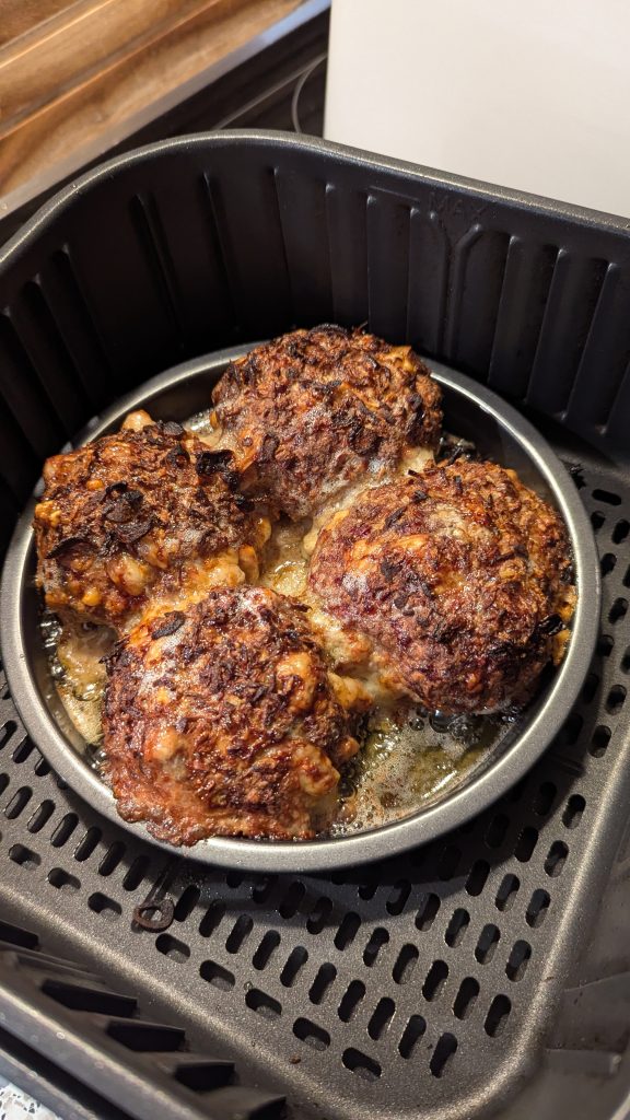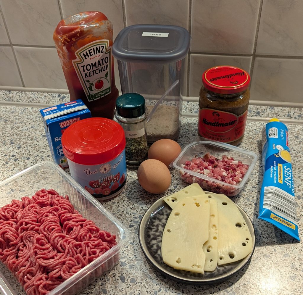 Airfryer mit der Röstplatte auf 200 Grad vorheizen. Für die Pflanzerl den Käse in kleine Würfel schneiden, mit Speckwürfeln, Majoran und Hackfleisch in eine Schüssel geben. Senf, Ketchup, Eier, Semmelbrösel, etwas Salz und Pfeffer dazugeben und gut verkneten.