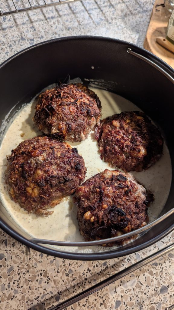 Für die Senfsauce süßen und scharfen Senf mit der Sahne verrühren. Röstplatte mit den Pflanzerln aus dem Korb nehmen, die Sauce in den Korb füllen, die Pflanzerl daraufsetzen und noch fünf Minuten garen.