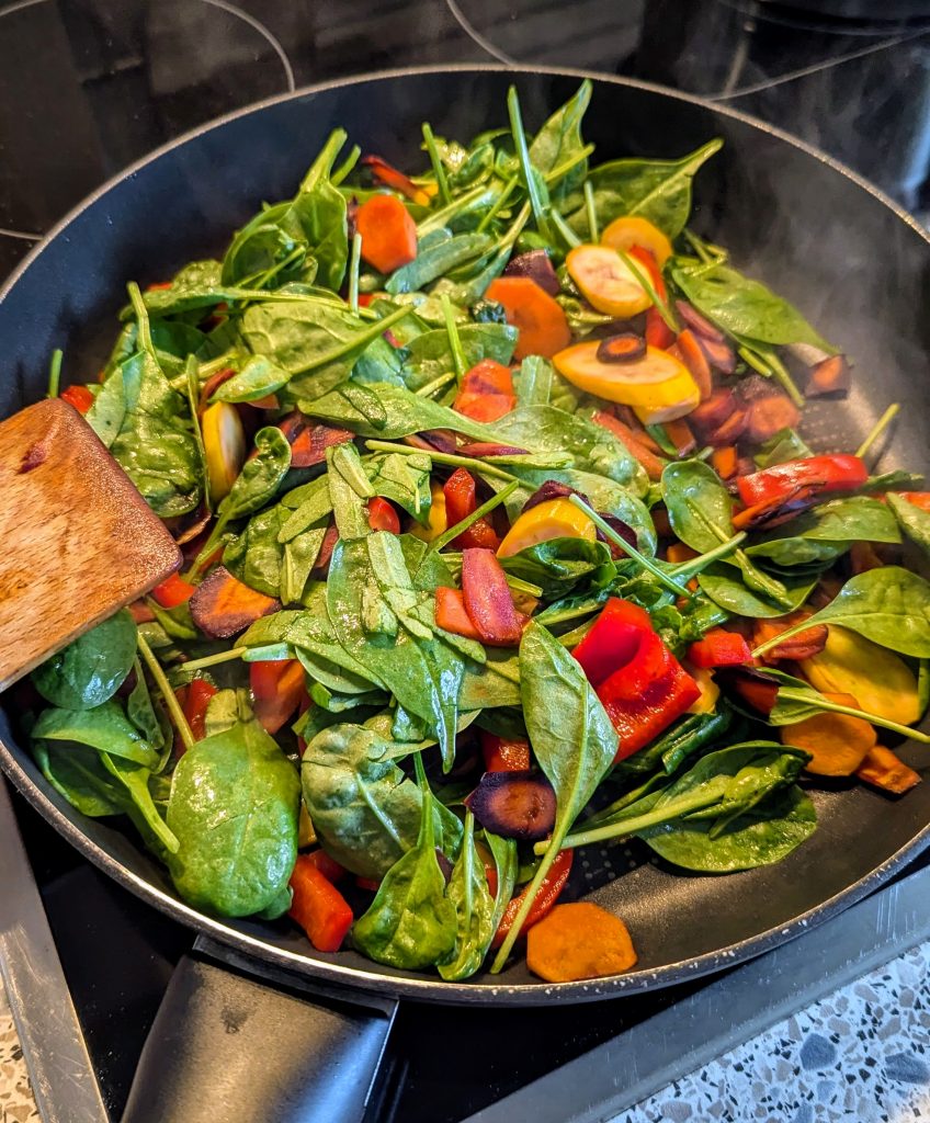 2 EL Öl in die Pfanne geben und heiß werden lassen. Zuerst die Möhren, dann das restliche Gemüse anbraten und am Schluss den Spinat dazu geben. Mit Salz und Pfeffer würzen.