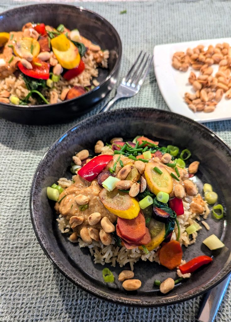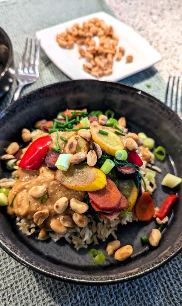 Den Reis auf einen Teller geben, darüber das Gemüse und die Sauce verteilen und mit den Erdnüssen bestreuen. Mit den gehackten Frühlingszwiebeln (oder Koriander) bestreuen und servieren.
