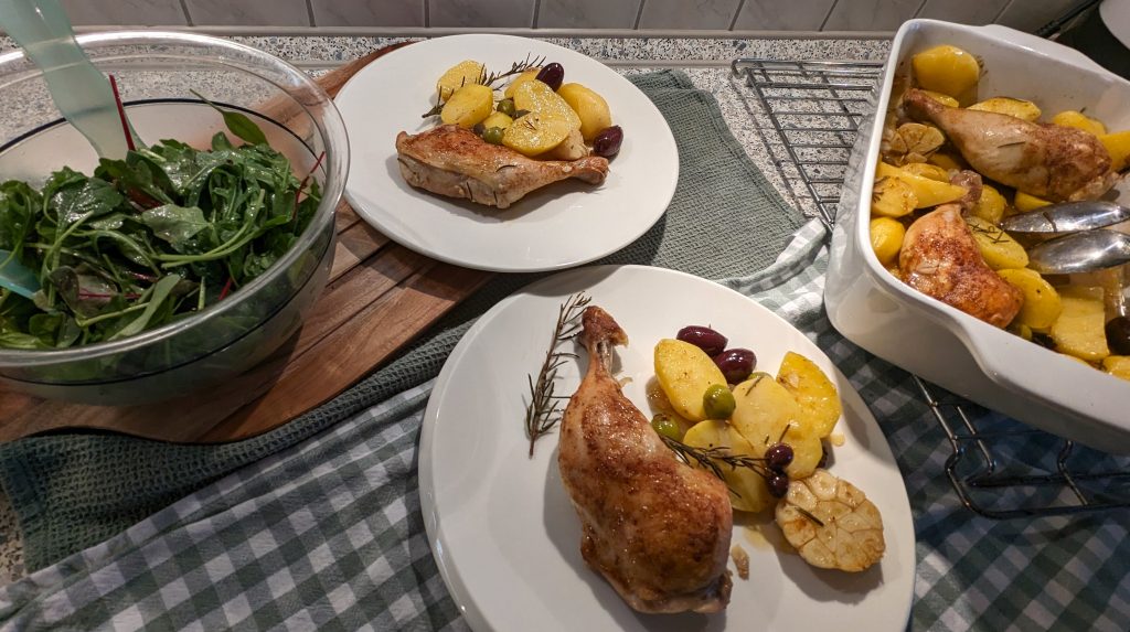 Bei 200° ca. 45 – 60 Minuten im Ofen braten. Die Keulen in dieser Zeit einmal wenden.