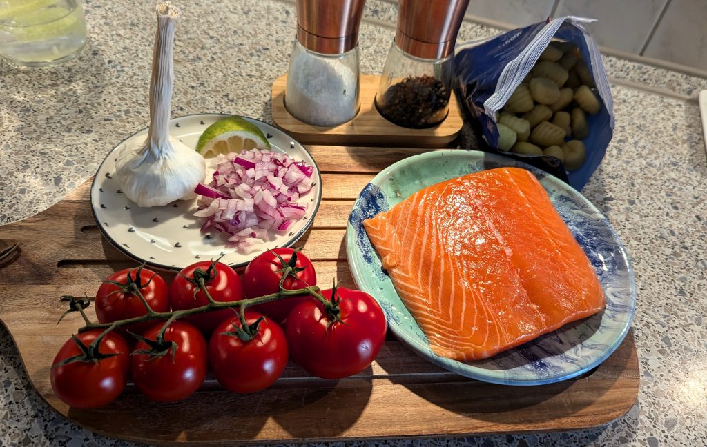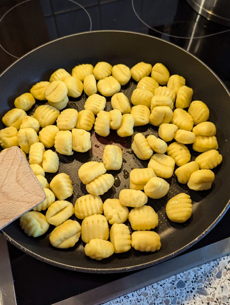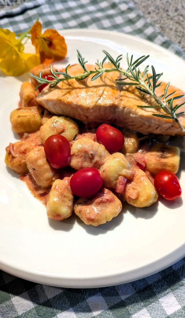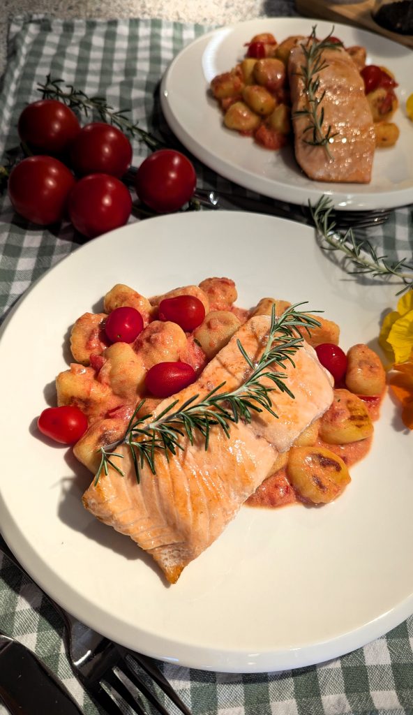 Die Lachs Stücke in der Pfanne anbraten und dann zusammen mit den Gnocchi auf Tellern anrichten