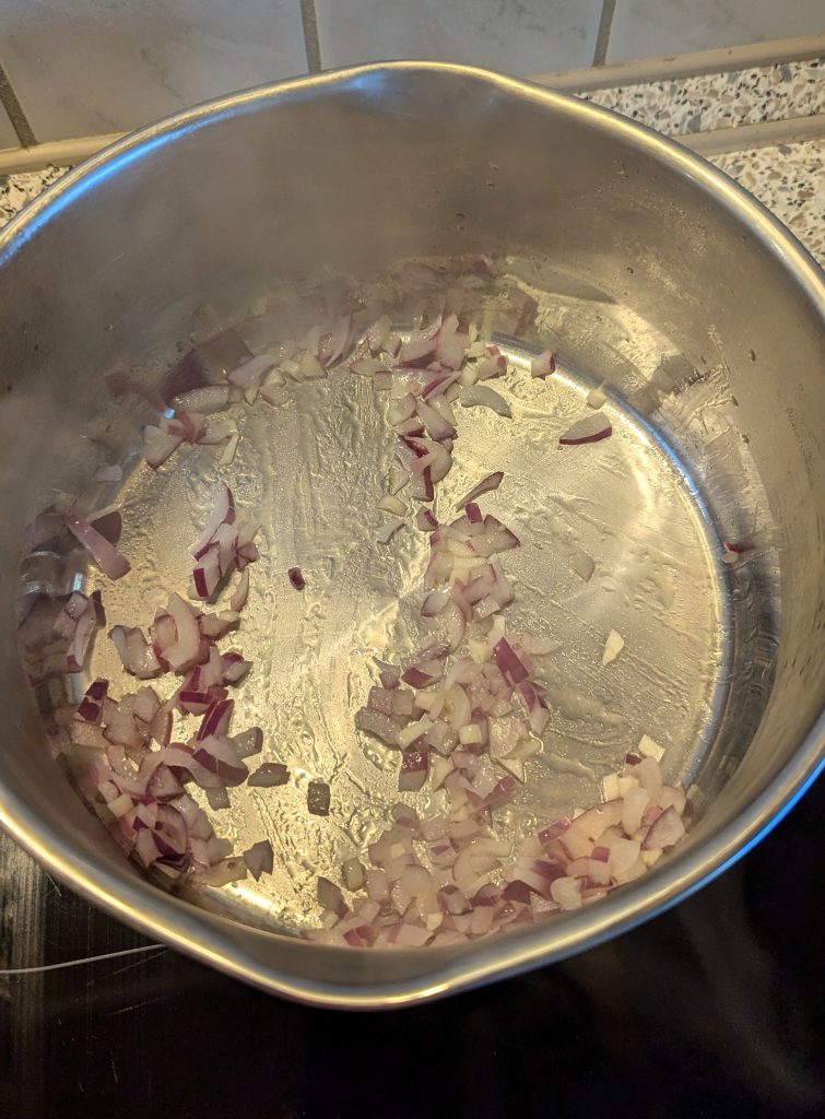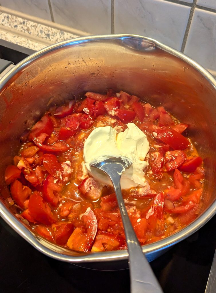 Frischkäse zu der Tomaten-Zwiebelmischung geben und gut vermengen.