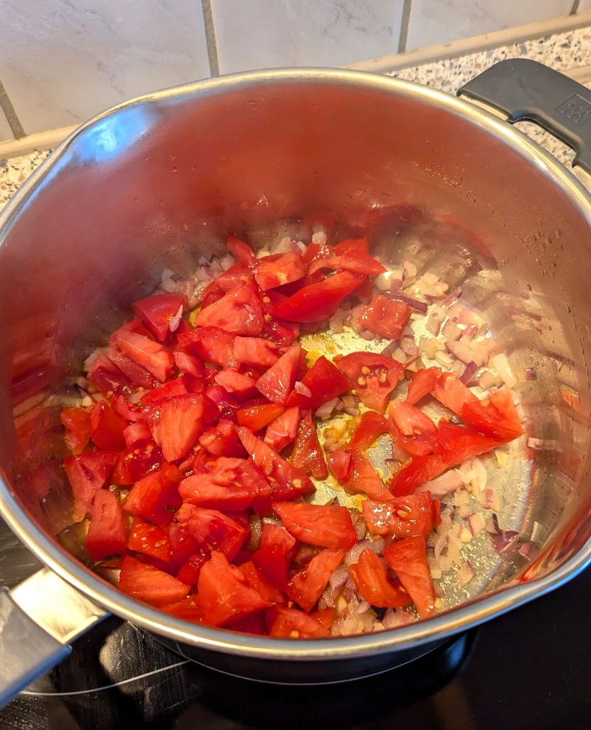 Zwiebel und Knoblauch schälen und in kleine Würfel schneiden. Tomaten waschen und ebenfalls würfeln. 1/2 TL Öl in einen Topf geben, darin die Zwiebeln und den Knoblauch für 2 Minuten sanft anbraten. Die Tomaten dazu geben, verrühren und weitere 2 Minuten braten. In der Zwischenzeit in einer Pfanne 1/2 EL Olivenöl erhitzen und darin die Gnocchi anbraten.
