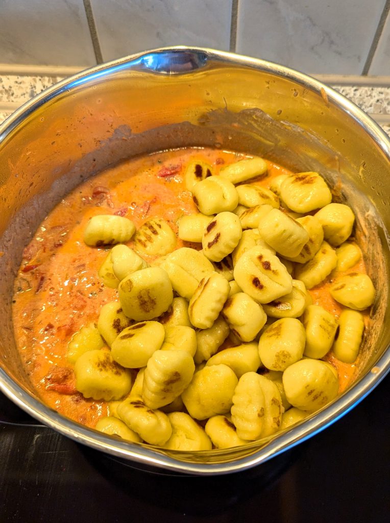 Die Tomatensauce mit Salz, Pfeffer und Basilikum kräftig abschmecken und die gebratenen Gnocchi darunter mischen. Bei kleiner Hitze auf dem Herd stehen lassen.