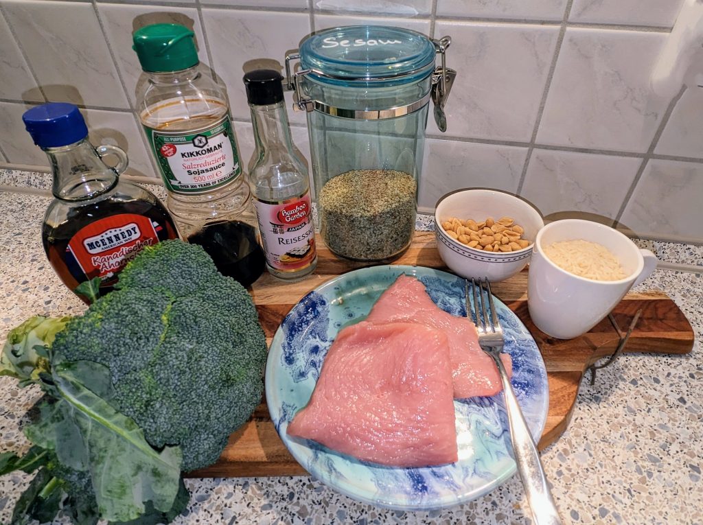 Brokkoli zum angebratenen Fleisch geben, mischen und kurz mit anbraten. Ahornsirup, Wasser und Sojasauce verrühren und in die Pfanne geben. Alles zusammen kurz aufkochen und ca. 3-4 Minuten einkochen lassen.