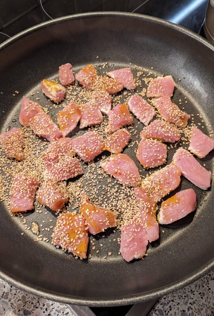 Fleisch in mundgerechte Stücke schneiden (für die vegetarische Variante den Tofu in Würfel schneiden) mit etwas Curry, Salz und Pfeffer würzen und in einer heißen Pfanne mit Sesamöl und Sesamsamen anbraten.