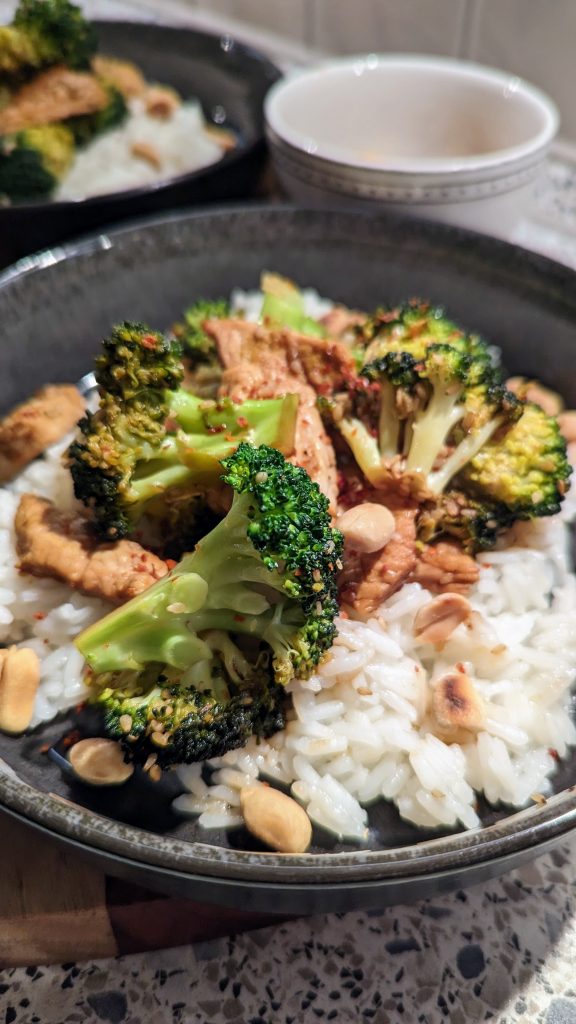 Den Reis in eine vorgewärmte Bowl geben, Tofu oder Hähnchen Brokkoli Mischung darauf verteilen und mit den Erdnüssen bestreuen.