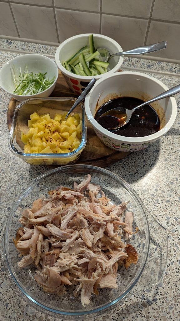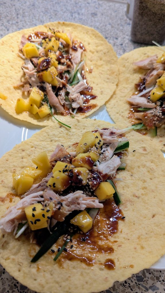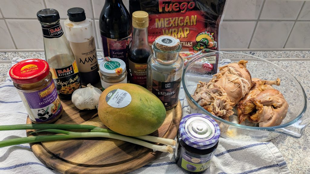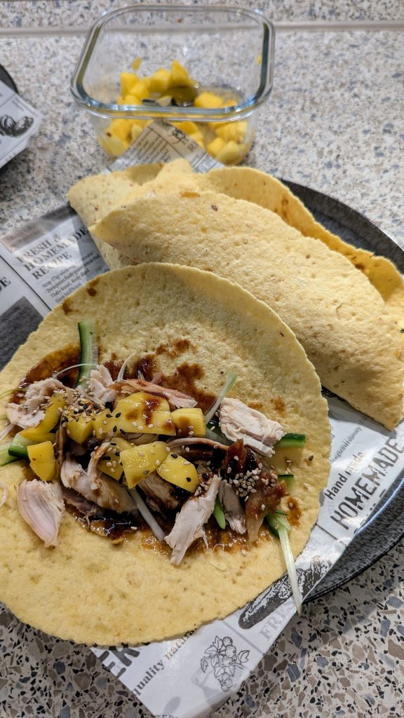 Das Hähnchen zerteilen und Fleisch in Streifen schneiden. Die warmen Fladen mit etwas Sauce bestreichen, Gurken, Fleisch und Frühlingszwiebelstreifen darauf verteilen. Mit Sauce beträufeln – nicht zuviel, da diese sehr würzig ist – und mit Mangosalsa und Sesam toppen.