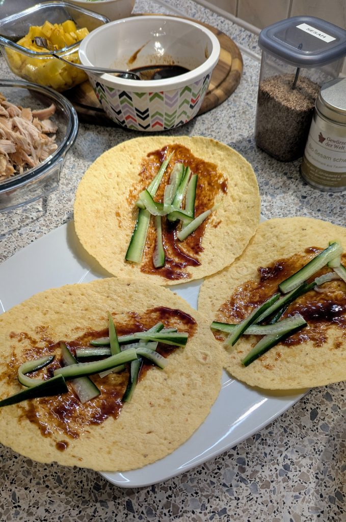 Anstatt klassischer Tortillas kannst du im Asiamarkt Mandarin-Pancakes (die hauchdünnen Fladen, die original zur Pekingente serviert werden) kaufen. Diese werden nur kurz gedämpft. Sie sind fast durchsichtig und wirken sehr hochwertig.