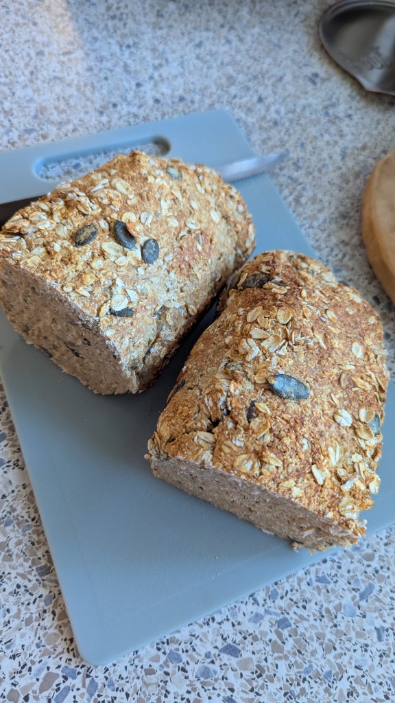 Das Brot nach dem Backen kurz in der Form abkühlen lassen, bevor du es vorsichtig stürzt. Auf einem Kuchengitter vollständig auskühlen lassen, damit es beim Schneiden nicht bricht.