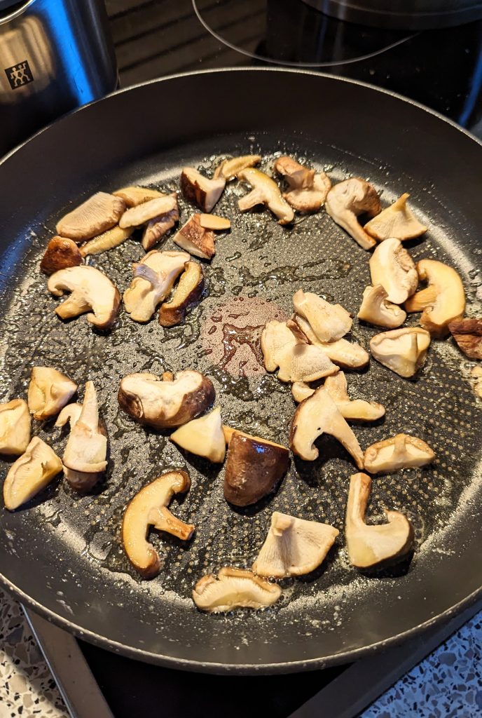 Shitake Pilze säubern und je nach Grösse klein schneiden, oder halbieren. In einer Pfanne mit Butter anbraten und mit Salz und Pfeffer würzen.
