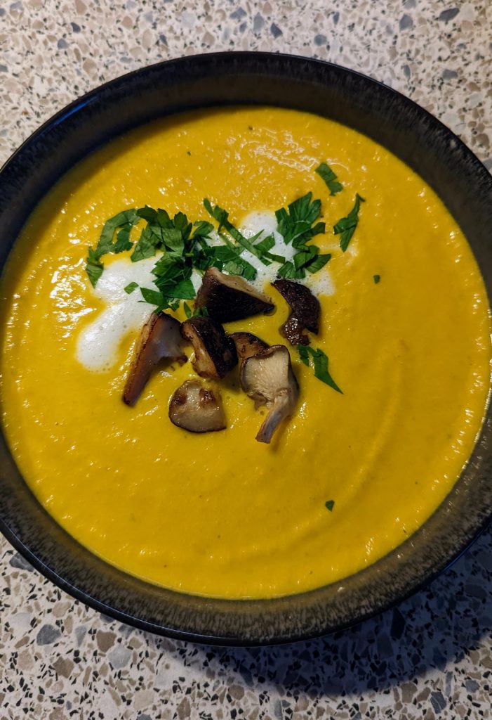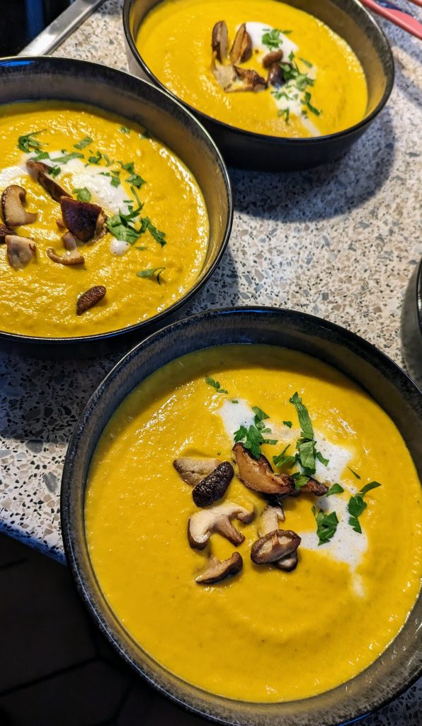 Die Suppe in Schalen anrichten und die gebratenen Pilze darauf anrichten. Bei uns gab es als Garnitur noch einen Klecks Milchschaum und Petersilie darüber. Die Suppe sollte leicht scharf und süß schmecken.