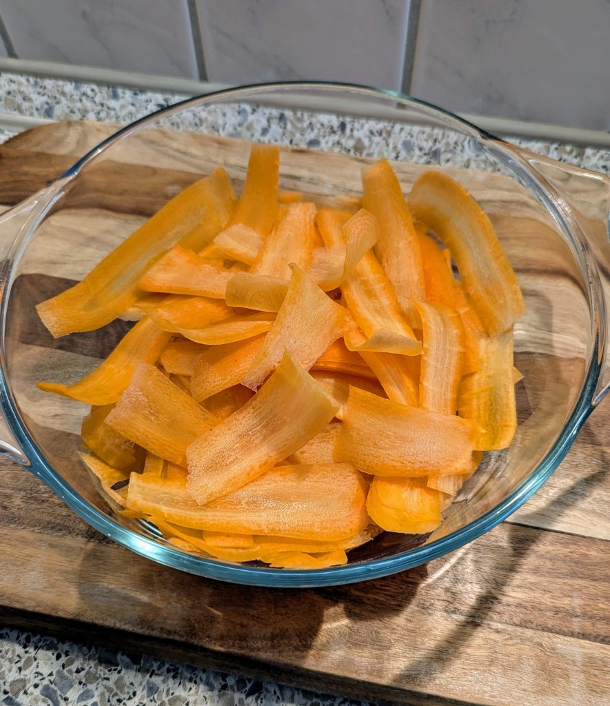 Möhren schälen und längs in ca. 0,5 cm dicke Scheiben schneiden, oder mit dem Sparschäler in Streifen schälen.