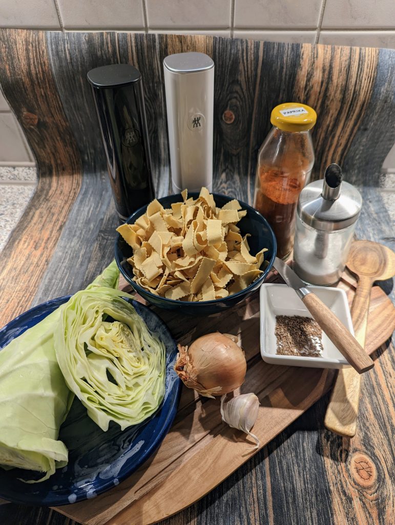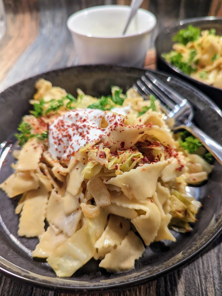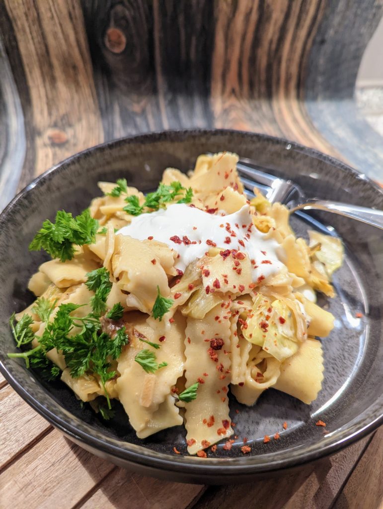 Nudeln nach Packungsanweisung im Salzwasser bissfest kochen, abgiessen und kalt abbrausen. Zwiebel + Knoblauch schälen und fein würfeln. Spitzkohl putzen und in ca. 3 cm grosse Fleckerl (Quadrate) schneiden. Öl in einer Pfanne erhitzen, Zwiebeln und Kohl darin bei mittlerer Hitze ca. 10 – 15 Min. hellbraun andünsten. Kümmel im Mörser zerkleinern (alternativ gemahlenen Kümmel) mit Knoblauch, Paprikapulver, Zucker, Salz + Pfeffer zu dem Kohl dazu geben und vermischen. Ca. 5 Min. weiter dünsten, bis der Zucker etwas karamellisiert ist. Mit Essig ablöschen und danach die Gemüsebrühe dazu geben. 5 Minuten weiter dünsten, bis der Kohl weich ist. Die Nudeln dazu geben und gut mischen. Mit Petersilienblättern, Salz + Pfeffer abschmecken. Auf den Tellern verteilen und darauf die saure Sahne geben. Mit Chilifliocken bestreuen und geniessen.