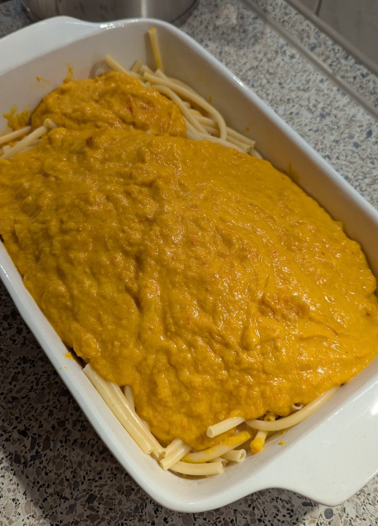 Vermische die gekochte Pasta mit der cremigen Kürbis-Käse-Sauce in einem grossen Topf oder einer Schüssel.