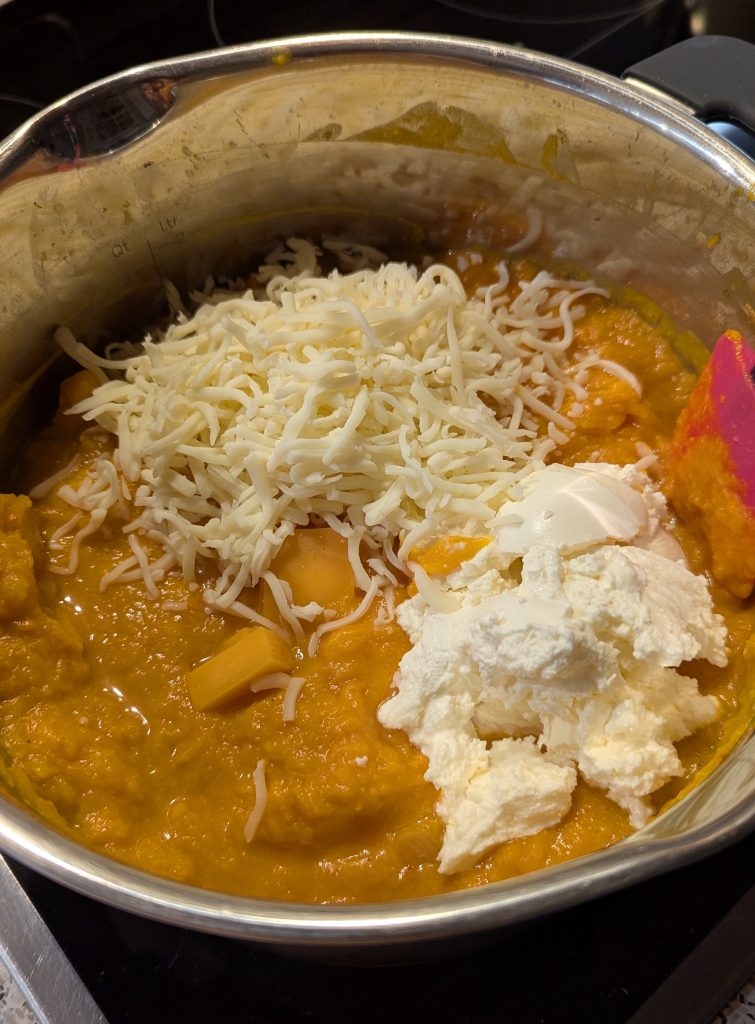 Frischkäse, ca. 3/4 vom Käse unter das Püree mischen, bis der Käse geschmolzen ist.