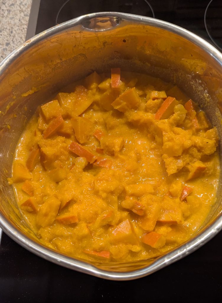 Die Kürbisstücke, Zwiebel und die Knoblauchzehe in einen Topf geben, mit Paprikapulver, Muskatnuss, Salz, Pfeffer und Chili würzen und gut vermischen. Die Milch zufügen und ca. 20 Minuten mit geschlossenem Deckel kochen, bis der Kürbis weich ist und zu einem cremigen Brei pürieren.