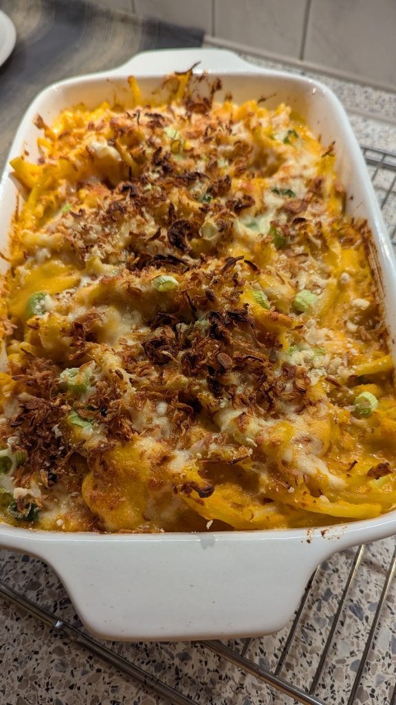 Fülle die Mac ’n‘ Cheese Mischung in eine grosse Auflaufform. Mit den gerösteten Zwiebeln, restlichem Käse, Panko und den Frühlingszwiebeln bestreuen und im vorgeheizten Ofen bei 180° ca. 20 Minuten backen, bis die Oberfläche goldbraun und leicht knusprig ist.