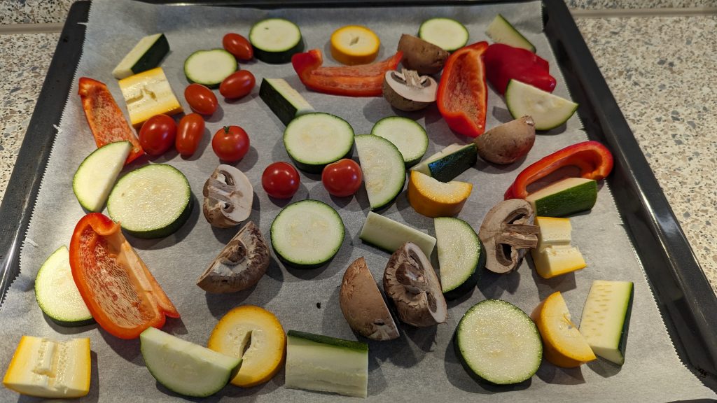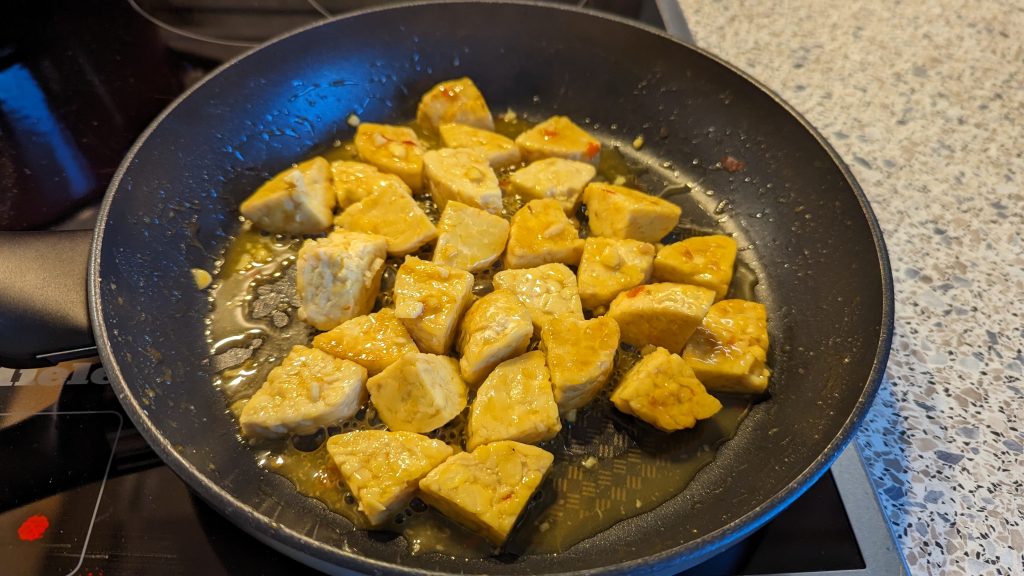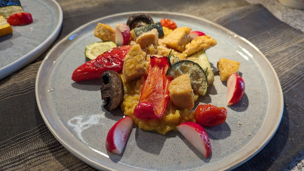 Kurkuma-Risotto mit Ofengemüse und glasiertem Tempeh