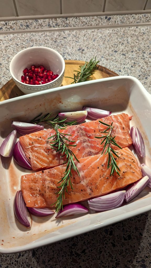 Backofen auf 200° Ober-/Unterhitze vorheizen. Die Zwiebeln schälen und achteln. Aus der Auflaufform die Marinade in den Topf zurück geben. Zum Lachs in der Auflaufform die Zwiebeln und den Rosmarin und die Hälfte der Granatapfelkerne geben. Die Form mit einer Alufolie abdecken und für 15 Minuten in den Backofen stellen.