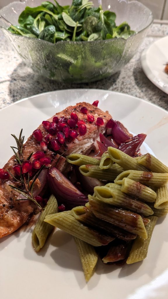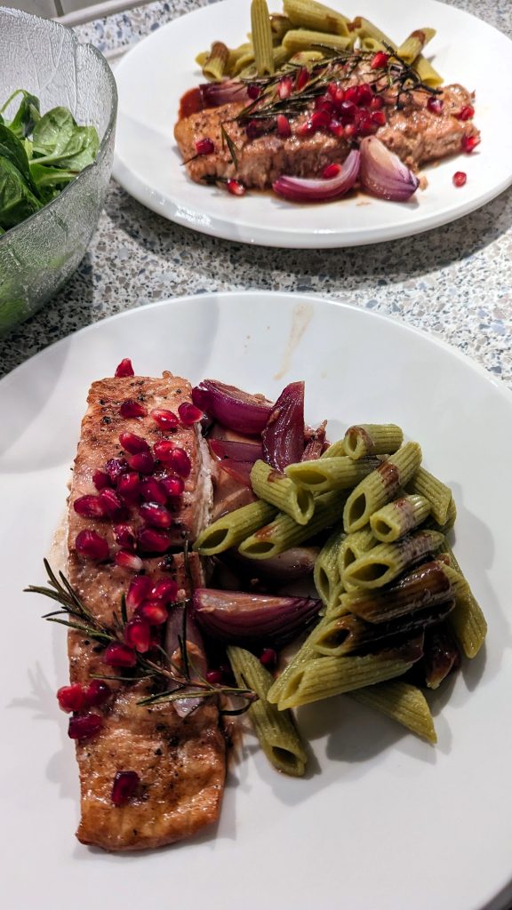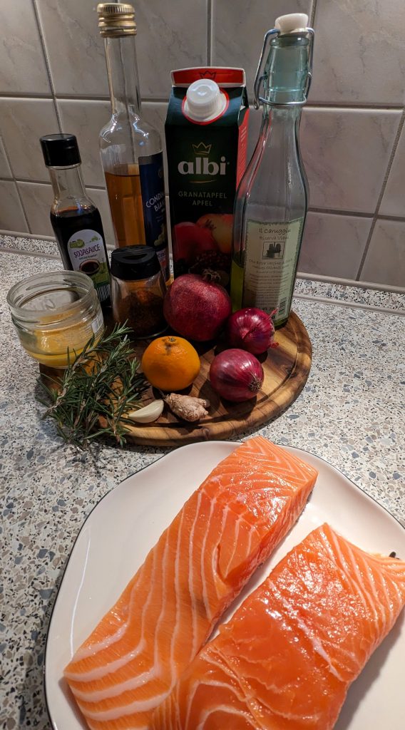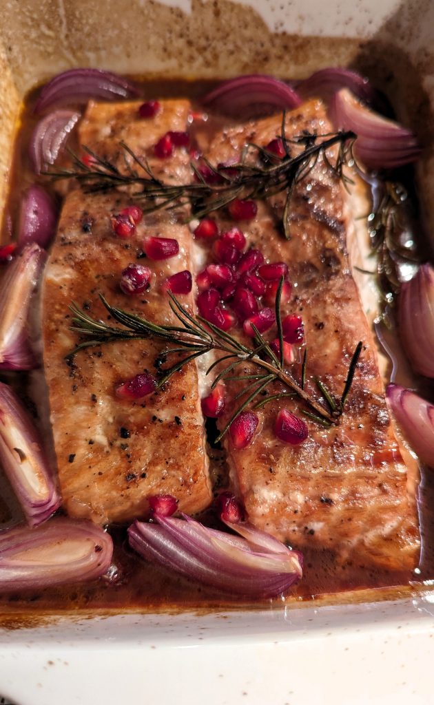Den fertigen Lachs auf Tellern anrichten, die restlichen Granatapfelkerne darüber verteilen und mit Rosmarin, Zwiebeln und der eingekochten Sauce servieren. Dazu passen Nudeln oder Reis.