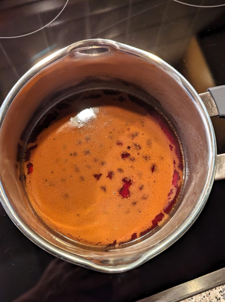 Ingwer + Knoblauch schälen und fein würfeln mit Sojasauce, Honig, Saft und Schale der Mandarine, Granatapfelsaft, Balsamico, Olivenöl, Butter und Chiliflocken in einen Topf geben und ca. 5 – 7 Minuten sanft köcheln lassen.