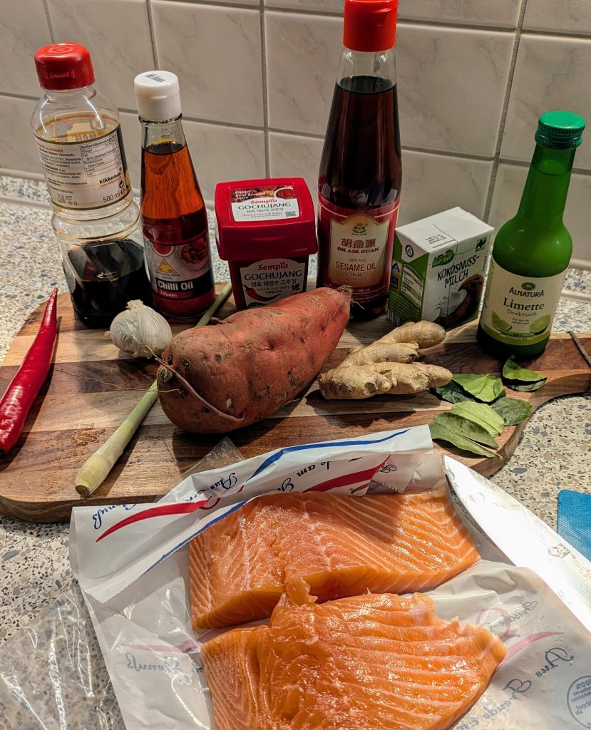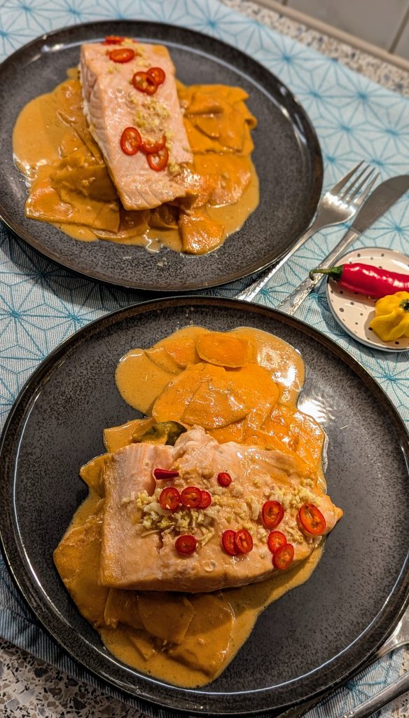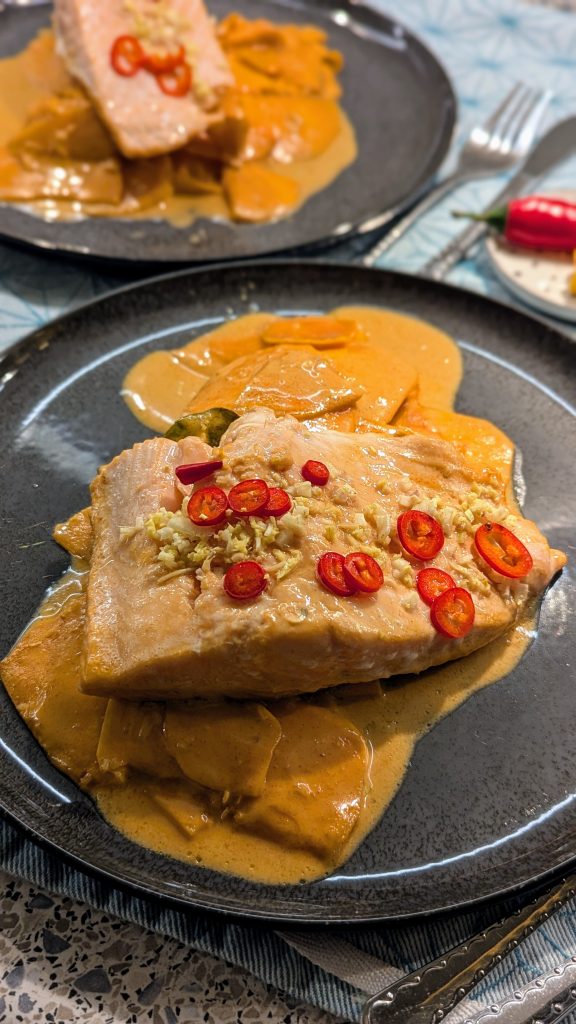Dieses Rezept kombiniert die Aromen von Lachs, cremigen Süßkartoffeln, Zitronengras und Ingwer zu einem köstlichen und gesunden Gericht.