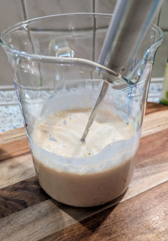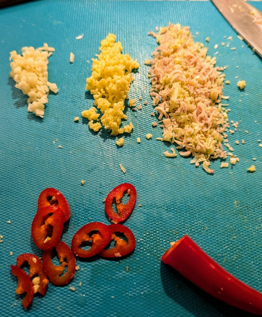Vom Zitronengras die Enden abschneiden und das äussere Blatt entfernen. Mit einem Holz das Zitronengras fest klopfen und fein hacken. Knoblauch schälen, die Chili von den Kernen befreien und beides ebenfalls fein schneiden. Kokosmilch, Gemüsebrühe, Sesamöl, Chili, Limettensaft, Gochujang, Chiliöl, 1EL Sojasauce, 1/2 TL Salz, je die 2/3 Ingwer, Knoblauch und Zitronengras vermischen.