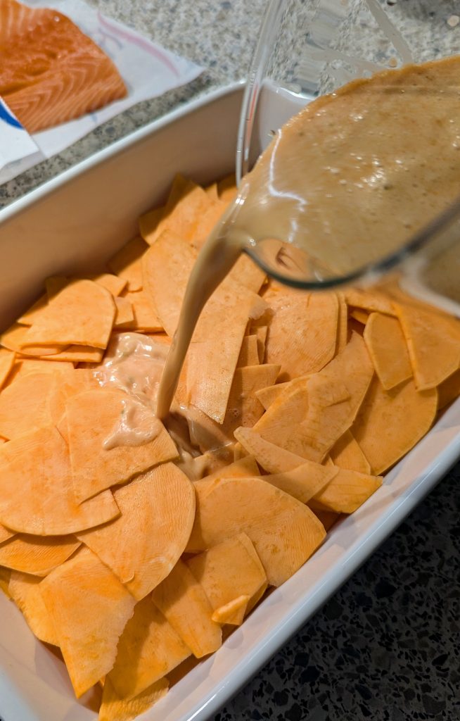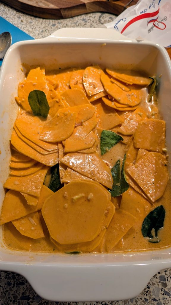 Backofen auf 200° Ober/Unterhitze vorheizen. Die Süsskartoffel schälen und in dünne Scheiben schneiden, oder hobeln. Die Scheiben in eine Auflaufform legen.
