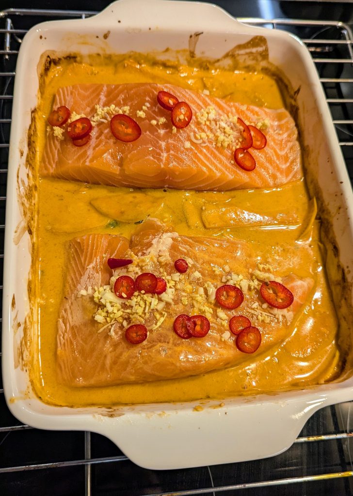 30 Minuten in den Backofen, bis die Süsskartoffeln gar sind – probieren! – dann den Lachs auf die Kartoffeln legen und die Temperatur auf 180° zurück schalten. Mit dem restlichen Zitronengras, Ingwer, Chili und Knoblauch bestreuen und weitere 10 Minuten in den Backofen stellen. Die Zeit kann natürlich auf den gewünschten Gargrad des Fisches angepasst werden.