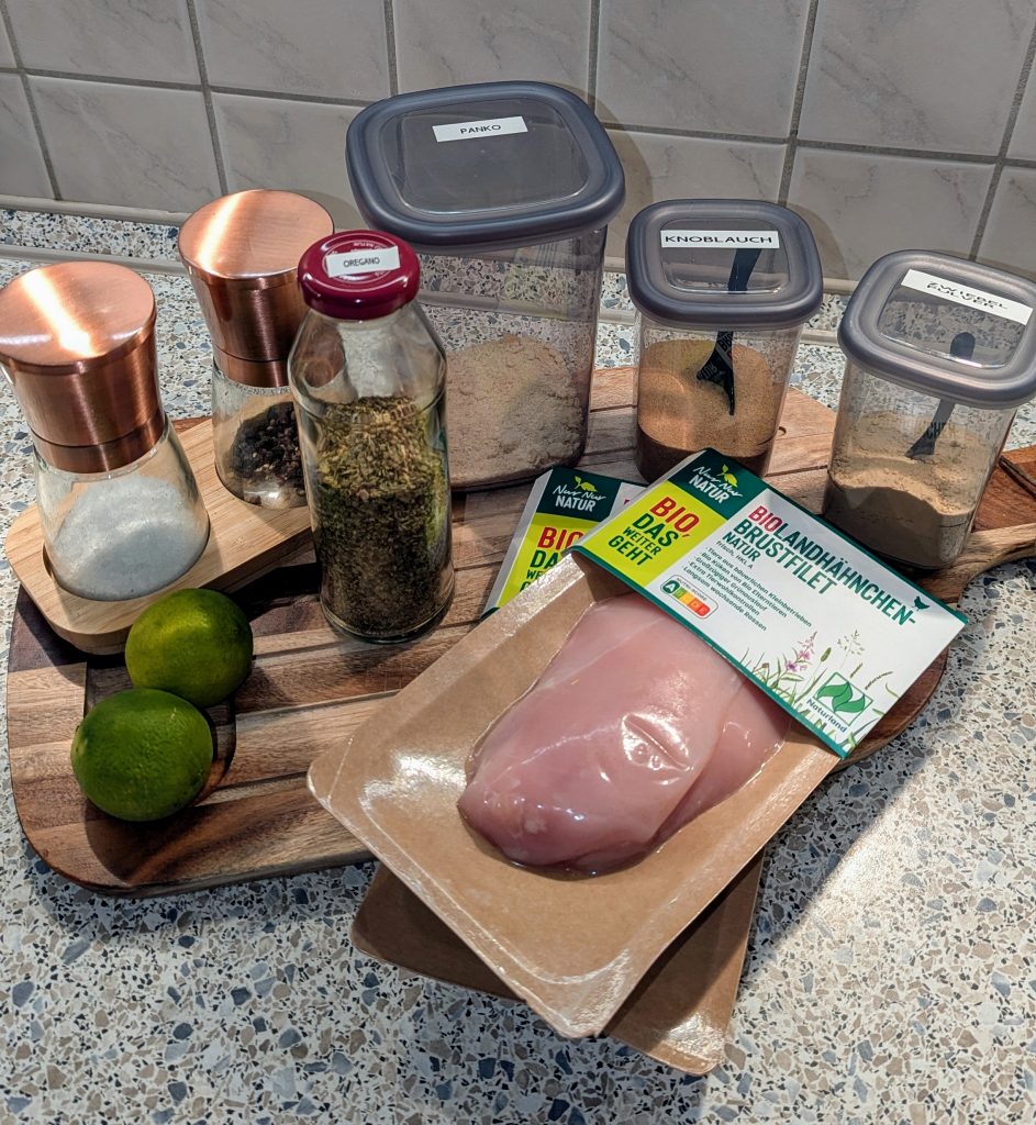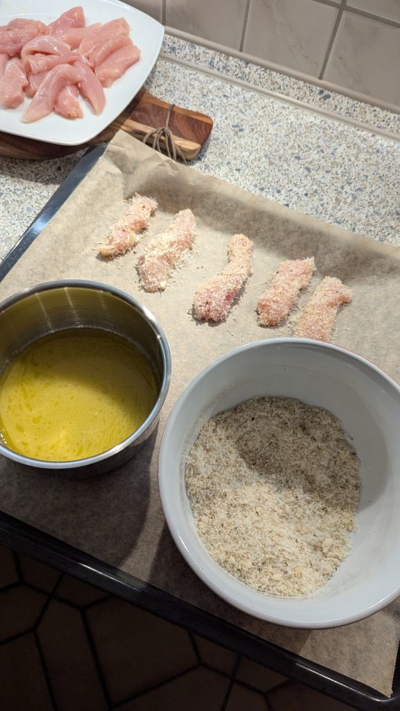 Hähnchenbrust in Streifen schneiden und diese Fleischstreifen in der Limettenbutter eintauchen und danach in der Panko-Gewürz-Mischung wälzen und auf das Backblech legen.