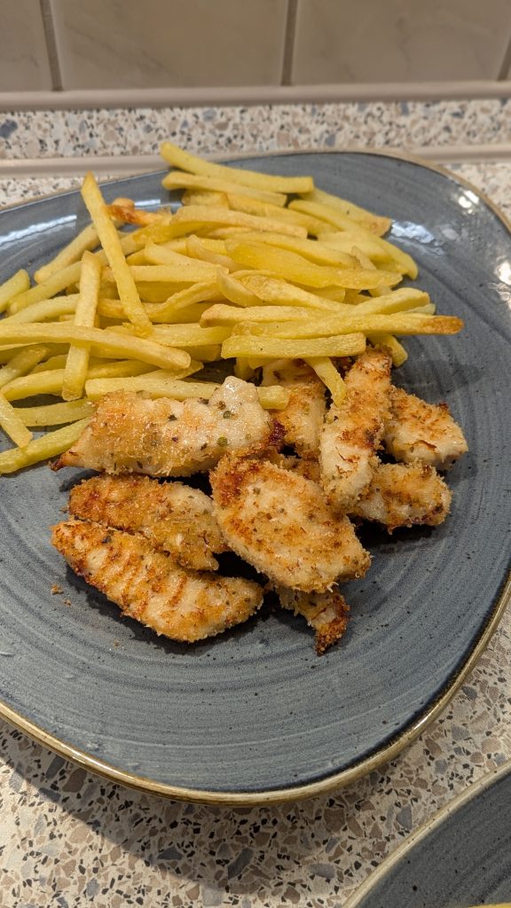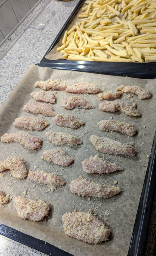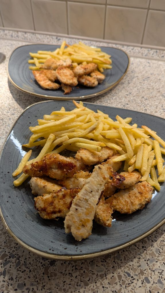 Im Backofen ca. 20-30 Minuten goldbraun backen. Wir legen auf das andere Backblech Pommes und somit ist schnell ein leckeres Gericht zubereitet. Dazu passt auf jeden Fall ein Salat.