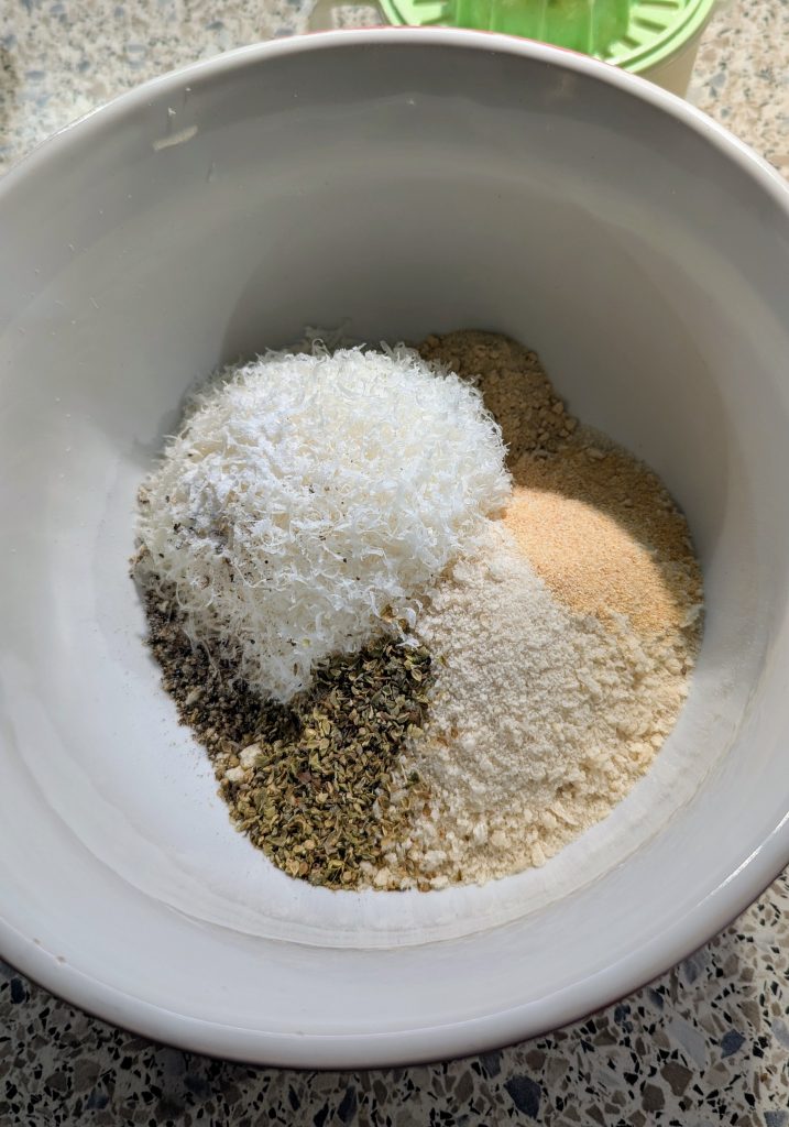 Panko, Parmesan, Knoblauchpulver, Zwiebelpulver, Salz, Pfeffer, getrocknete Kräuter und Limettenschale in einer Schüssel vermischen.