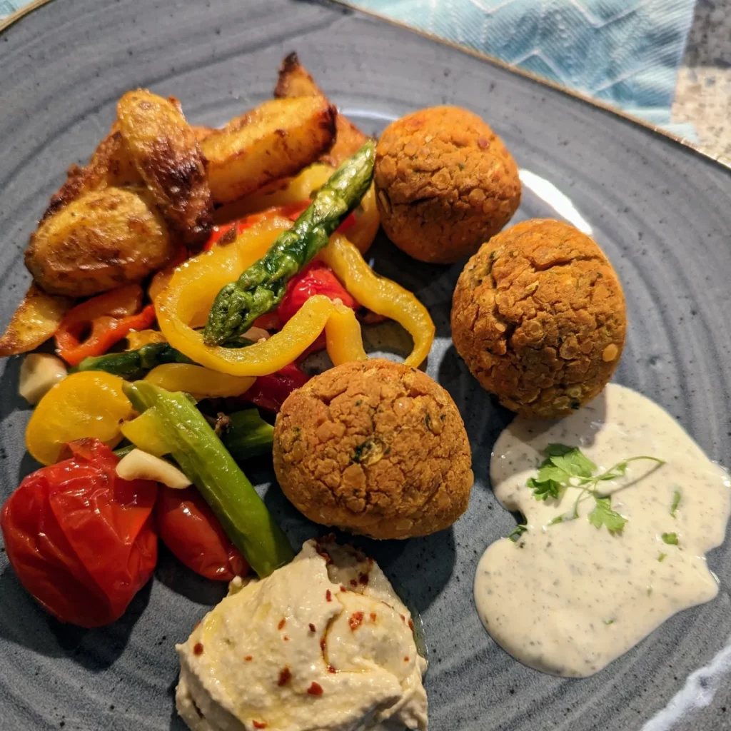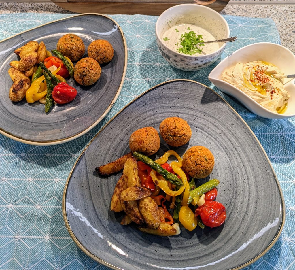 Die Linsenbällchen mit den Ofenkartoffeln und dem Gemüse anrichten. Nach Belieben mit dem Joghurt-Dip servieren.