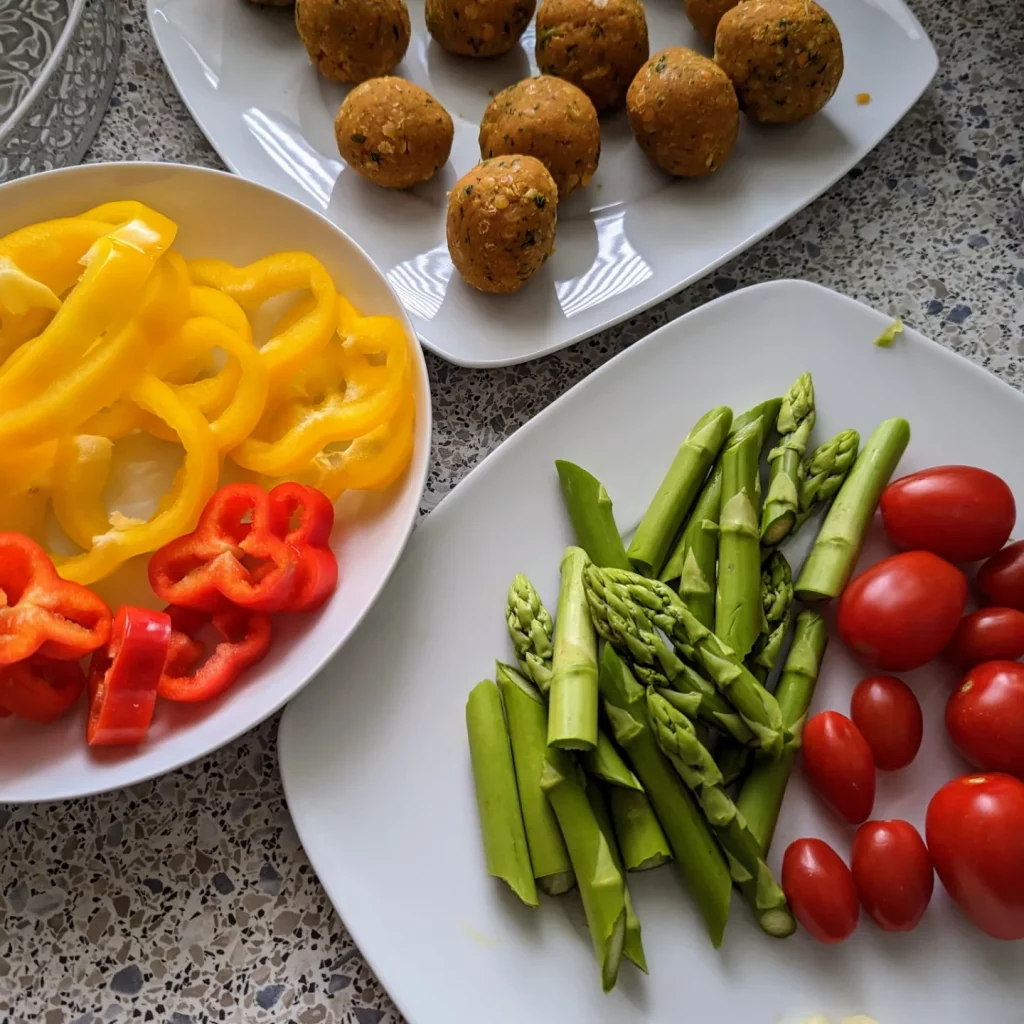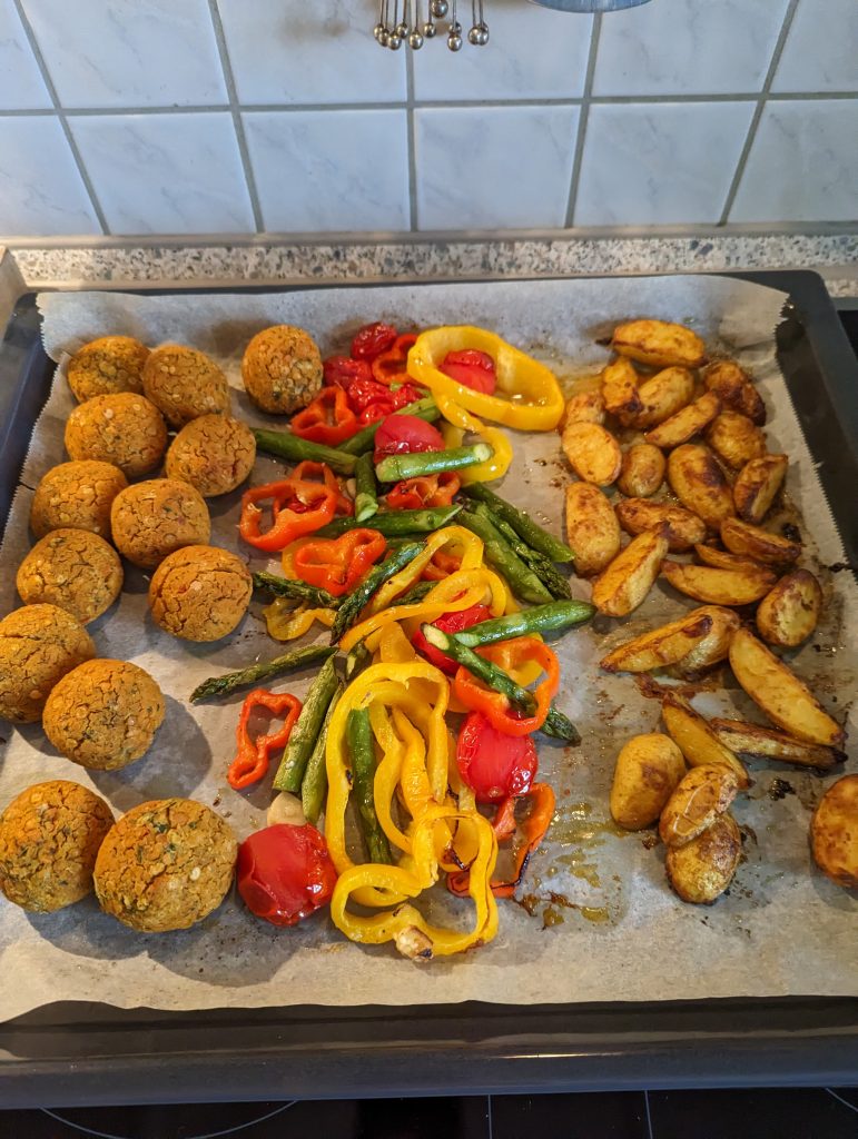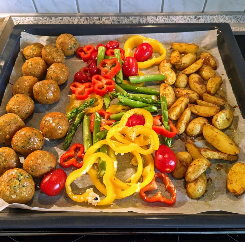 Die Ofenkartoffeln und das Gemüse für ca. 20 Minuten im vorgeheizten Ofen backen. Danach die Linsenbällchen vorsichtig auf dem gleichen Blech oder einem zweiten Backblech verteilen und alles zusammen für weitere 15-20 Minuten backen, bis die Kartoffeln goldbraun und zart und die Linsenbällchen leicht knusprig sind.