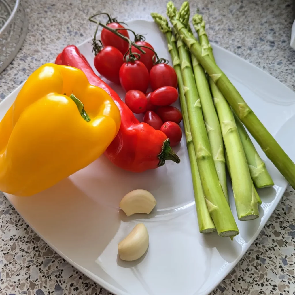 Ein Backblech mit Backpapier belegen. Den Backofen auf 200°C Ober-/Unterhitze vorheizen. Die Kartoffelspalten, Spargel, Paprika- und Knoblauch in einer großen Schüssel mit Olivenöl, Paprikapulver, Rosmarin, Salz und Pfeffer vermischen. Alles auf einem Backblech verteilen.