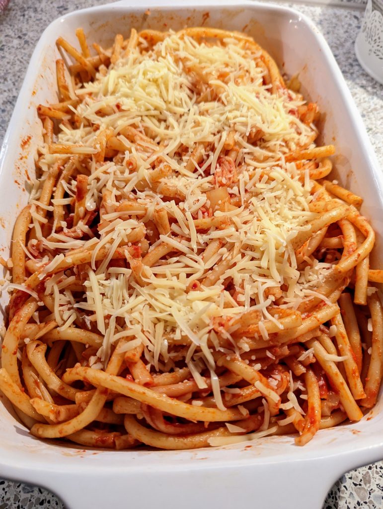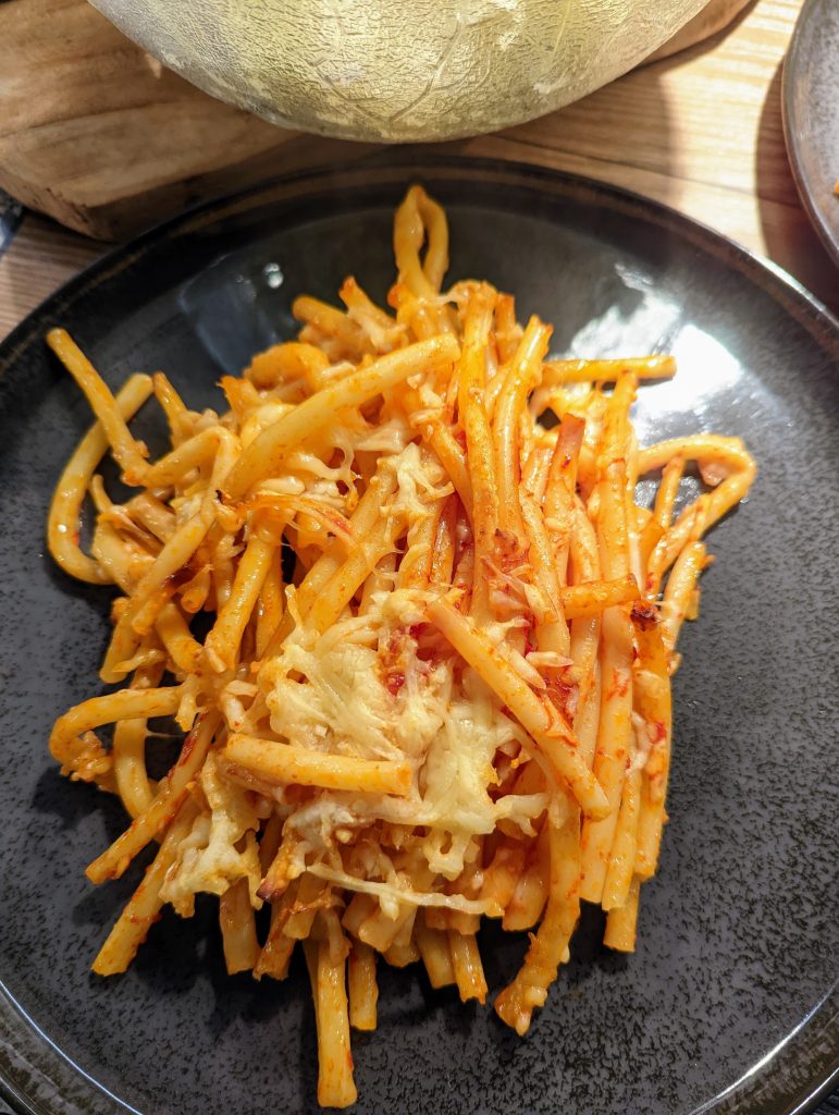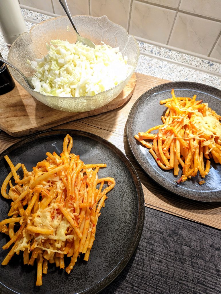 Bei ca. 180 Grad für ca. 20 Minuten in den Backofen. Die Nudeln sind perfekt, wenn die Spitzen leicht knusprig aussehen.
