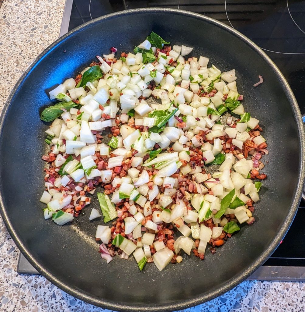 Zwiebeln, Knoblauch und die Mangoldstiele dazu geben und weitere 3-4 Minuten braten.