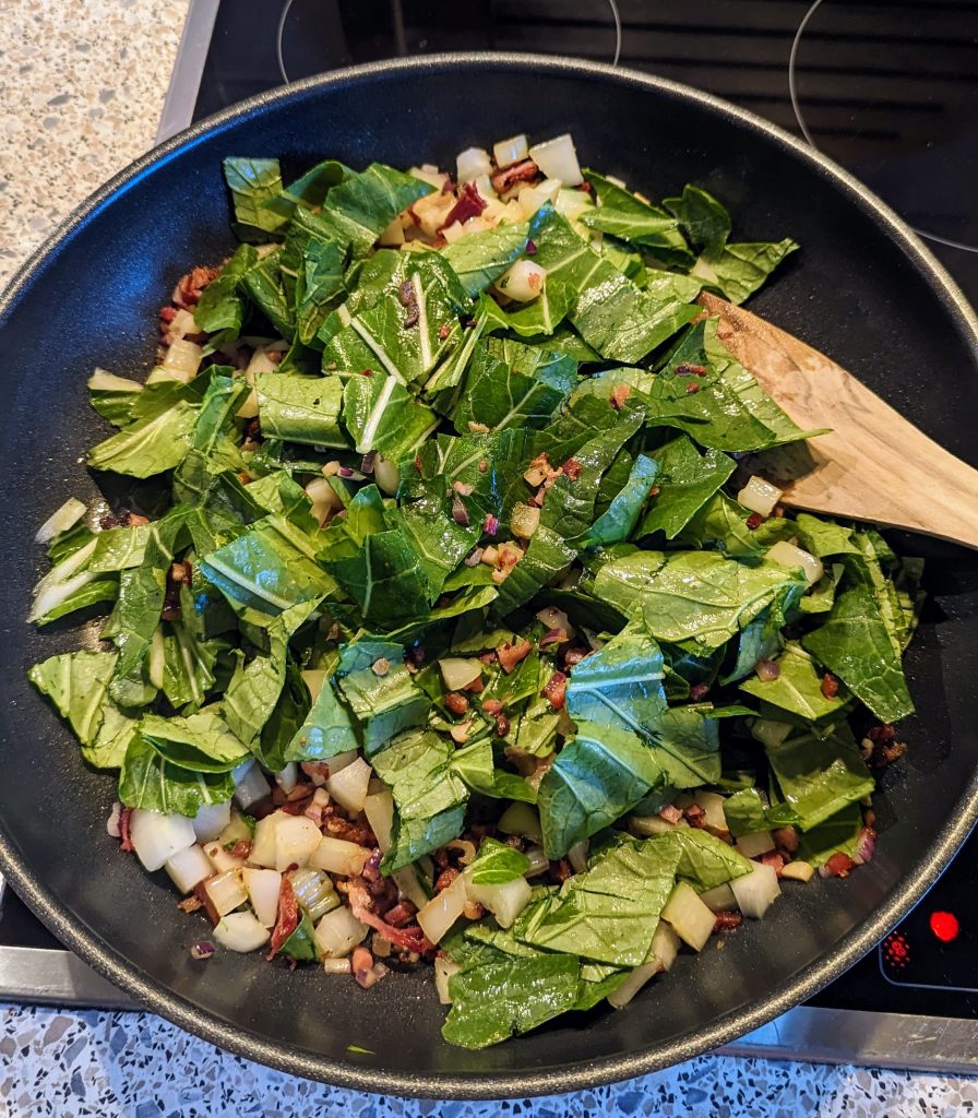 Den grünen Teil der Mangoldblätter hinzufügen und zusammenfallen lassen, bis die Blätter weich sind (ca. 5 Minuten). Mit Salz, Pfeffer und Muskatnuss würzen.