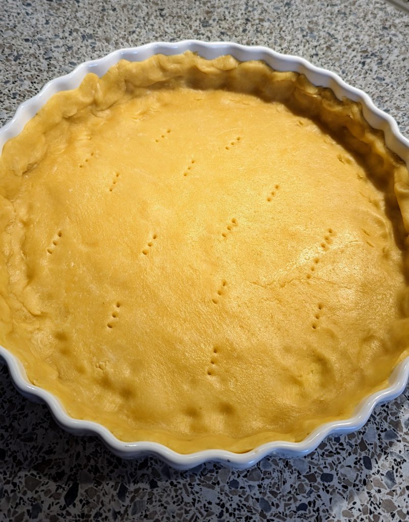 Den Teigboden mit einer Gabel mehrmals einstechen.